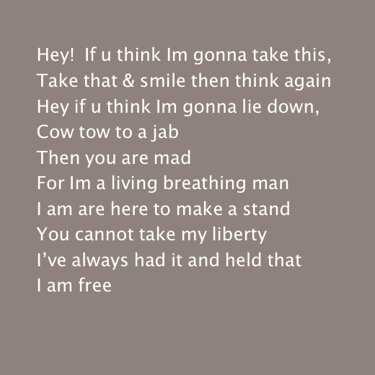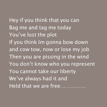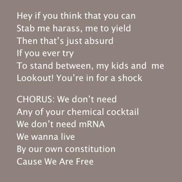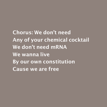 Acoustic Rock Anthem, protest song - against mandates and tyranny. Written during lockdown In Australia in 2021. Wake Up is about standing, reclaiming the line stepped over by those intent on taking freedoms. Each verse starts with a loud cry 'Hey' Wake Up - you cant take my freedom of speech, movement, association and my responsibility for my children. The chorus stands triumphant declaring 'We don't need your chemical cocktail, We don't need mRNA, we want to live by our own constitution. We are free!'.